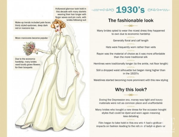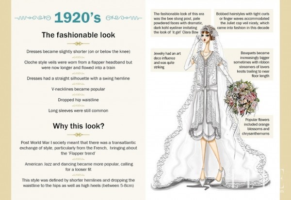 1920年代,第一次世界大戰(zhàn)期間,婚紗的整體風(fēng)格更加偏向大西洋彼岸的美國(guó),而美國(guó)的Jazz和舞蹈在當(dāng)時(shí)風(fēng)靡一時(shí),因此,婚紗也顯得更為直筒寬松,長(zhǎng)度也變短,露出腳踝,腰線(xiàn)也下降了很多,頭紗更偏向于園丁似的鐘形女帽。