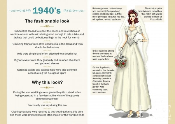 1940年代,還處于戰(zhàn)爭(zhēng)時(shí)期,婚禮進(jìn)行得都很倉(cāng)促,大家會(huì)更加注重實(shí)用性。裙子更加偏向于泡泡袖的設(shè)計(jì),緊束的腰肢是亮點(diǎn),頭紗通常和帽子連在一起佩戴。
