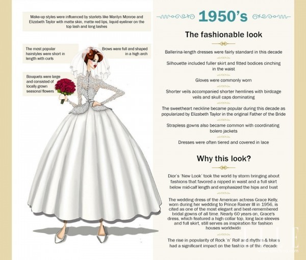 1950年代,Dior的新裝就像一陣旋風(fēng)席卷了時(shí)尚界,而在1956年美國(guó)女演員Grace Kelly與Rainer三世的婚禮上,她的著裝也迅速風(fēng)靡了世界。心形的領(lǐng)口無(wú)肩帶內(nèi)襯加上夾克的兩件套婚紗變得很受歡迎,頭紗的長(zhǎng)度也變短了。