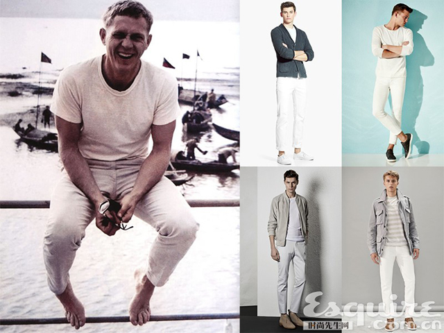 白色真是一個(gè)很討喜的顏色,而且?guī)缀鯖](méi)有人穿上白色會(huì)不好看!當(dāng)然在熒幕上和私服把一身白色穿出名的當(dāng)屬Steve McQueen!皌he King of Cool”的頭銜不是虛的,有太多代表他風(fēng)格的服裝,包括皮夾克、賽車服、卡其褲等等,但是是他把白色T恤×白色牛仔褲穿出利落又硬漢的風(fēng)格,上世紀(jì)60、70年代的照片放今天看一點(diǎn)也不過(guò)時(shí)。