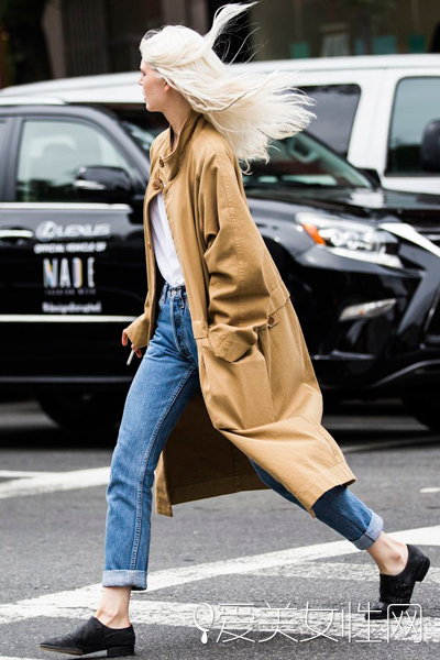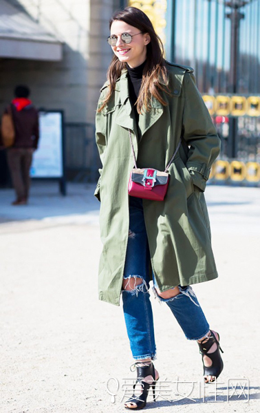 說說造型:原本破洞牛仔的造型真的有點太隨意和街頭,軍裝風衣給了造型硬朗的氣場。