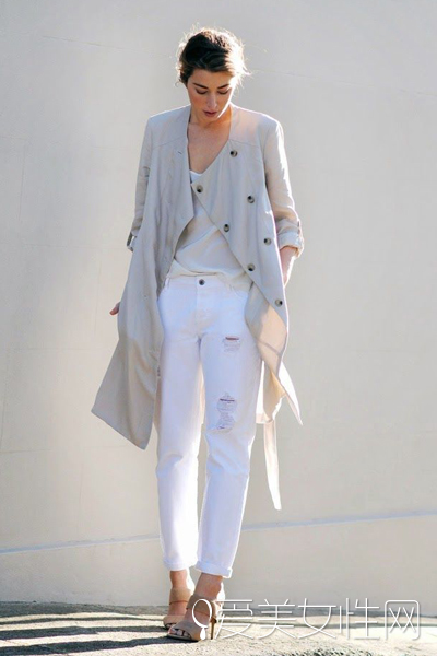 裸色背心+白色牛仔褲+白色長款風衣+露趾高跟鞋