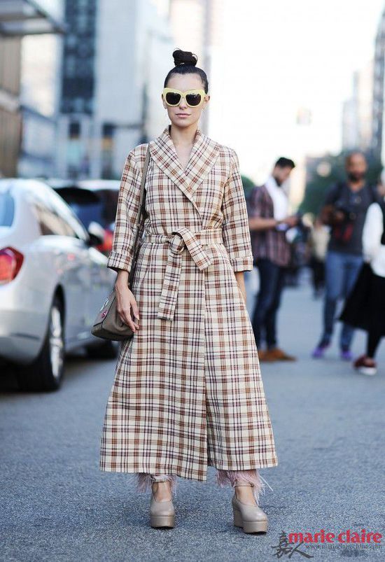 街頭潮人身穿條紋款廓形大衣時(shí)尚街拍。