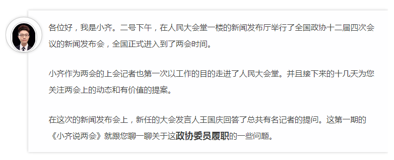 但當(dāng)然了,這也是個別委員的個別現(xiàn)象。小齊作為跑會記者也可以看到我們的大會為更好地讓代表委員履職做了細(xì)致充分的準(zhǔn)備。