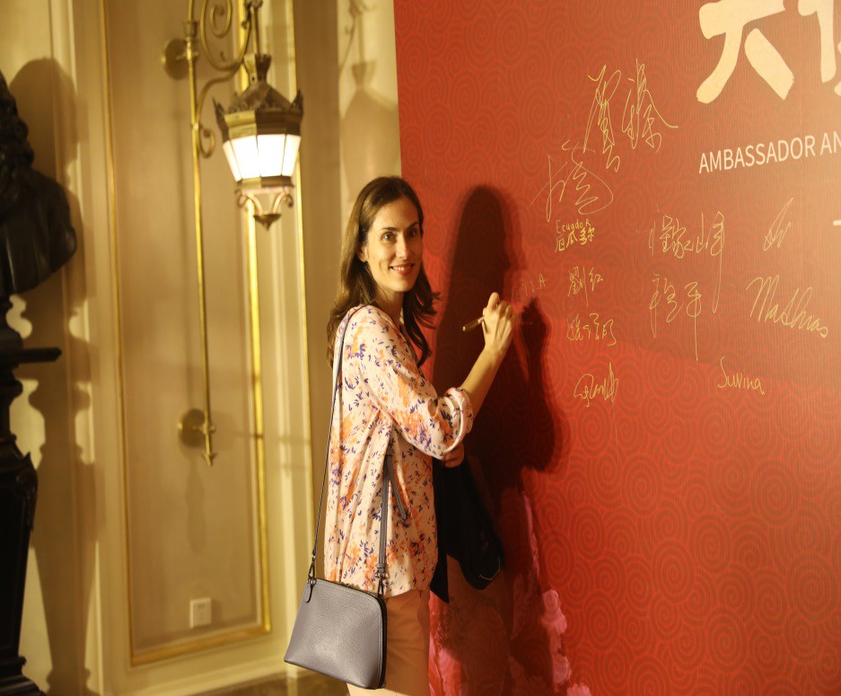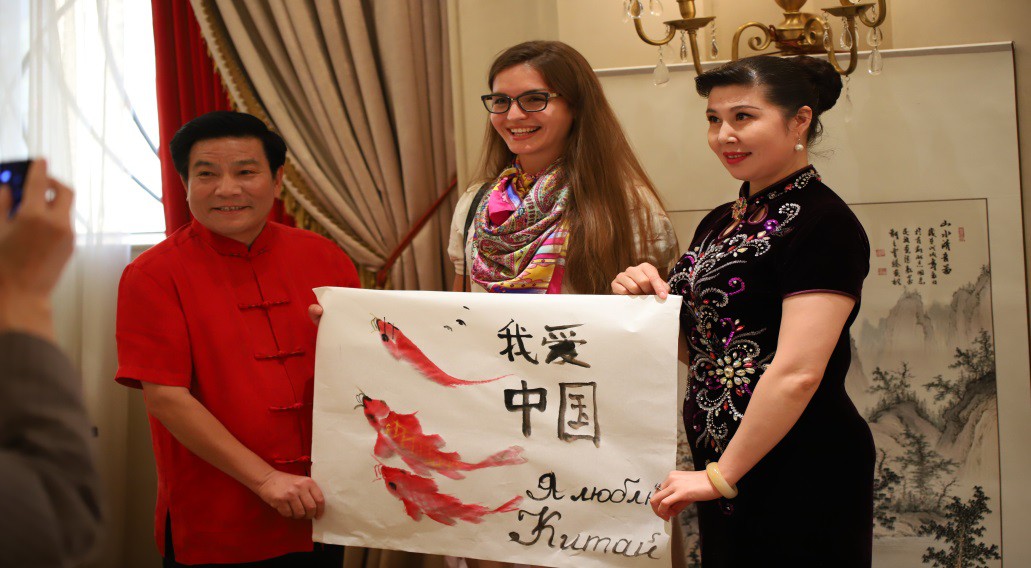 著名書畫大師歐陽中石的關(guān)門弟子王忠友也現(xiàn)場揮毫潑墨,畫出了象征幸福的紅色鯉魚,中外使節(jié)及夫人紛紛拿起毛筆,在畫作上寫下“我愛中國”等漢字,一起完成了一副代表中外友誼