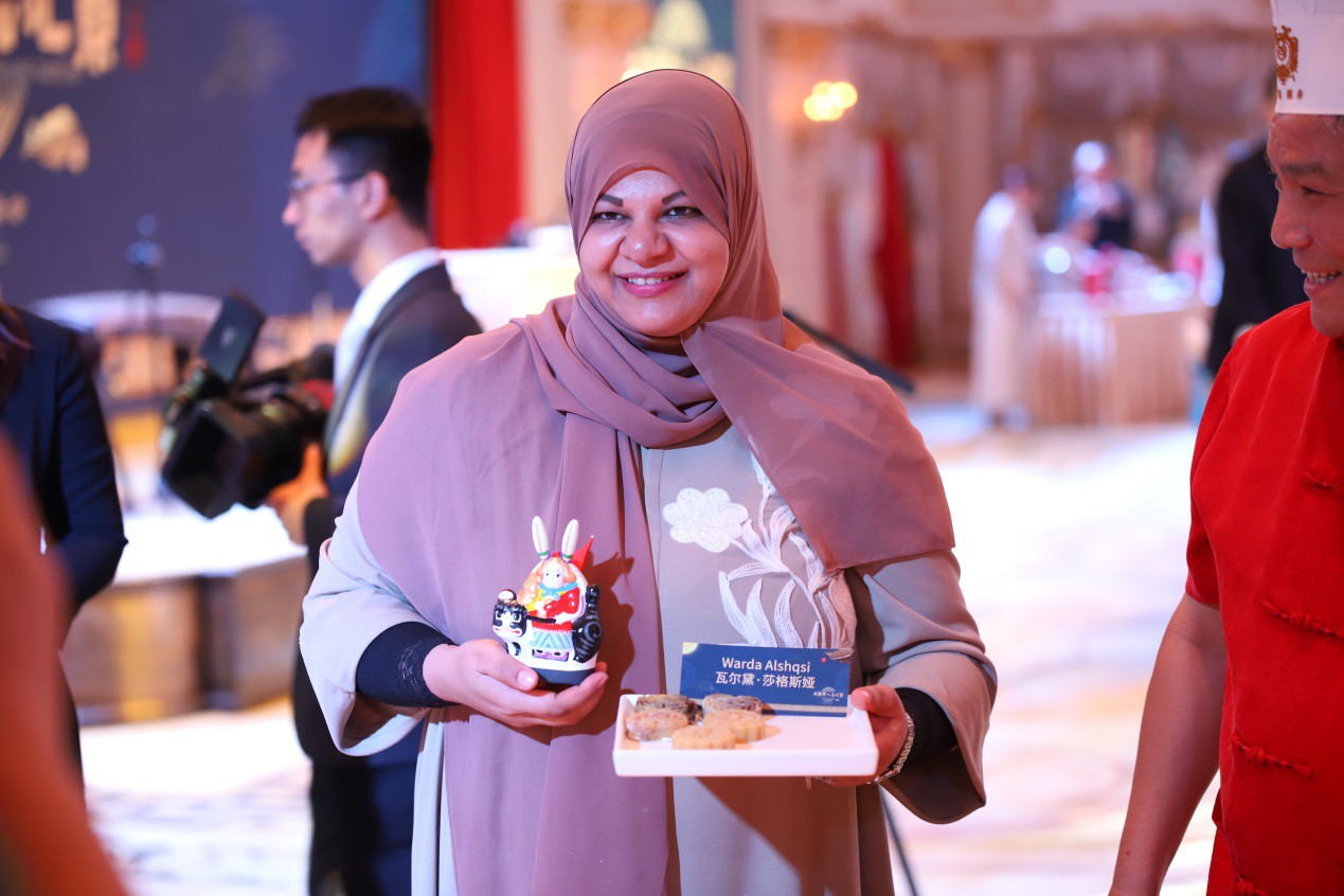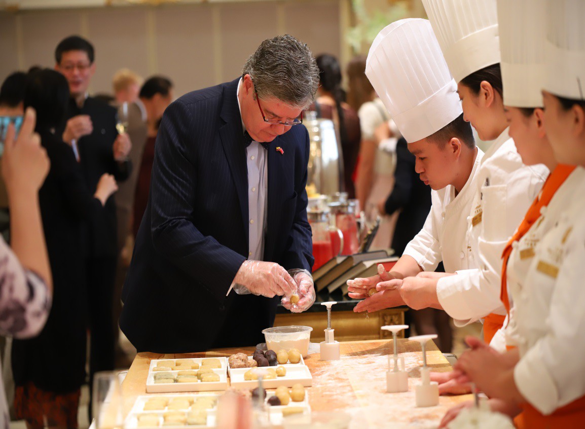 隨后,中外使節(jié)及夫人們?cè)谥袊纥c(diǎn)大師的指導(dǎo)下饒有興致地親自動(dòng)手制作了月餅。