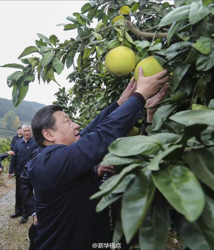 【現(xiàn)場(chǎng)】2013年11月3日,湘西州。山道狹窄,看到背著滿簍柚子的村民,習(xí)近平問“重不重?”聽說有五六十斤,他趕緊側(cè)身說“你快走吧,背著很重”。枝頭掛滿柚子,村民們正在采摘,習(xí)近平捧住一個(gè)柚子,輕輕一擰就摘了下來。一連輕松摘了兩個(gè),他幽默地說:“這是技術(shù)活啊!薄
