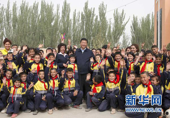 今年4月28日,習(xí)近平在喀什地區(qū)的疏附縣托克扎克鎮(zhèn)中心小學(xué)同師生們合影。新華社記者 謝環(huán)馳 攝
