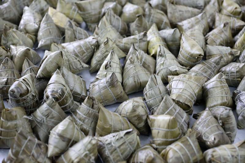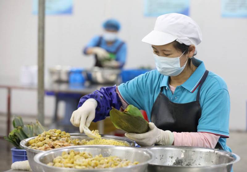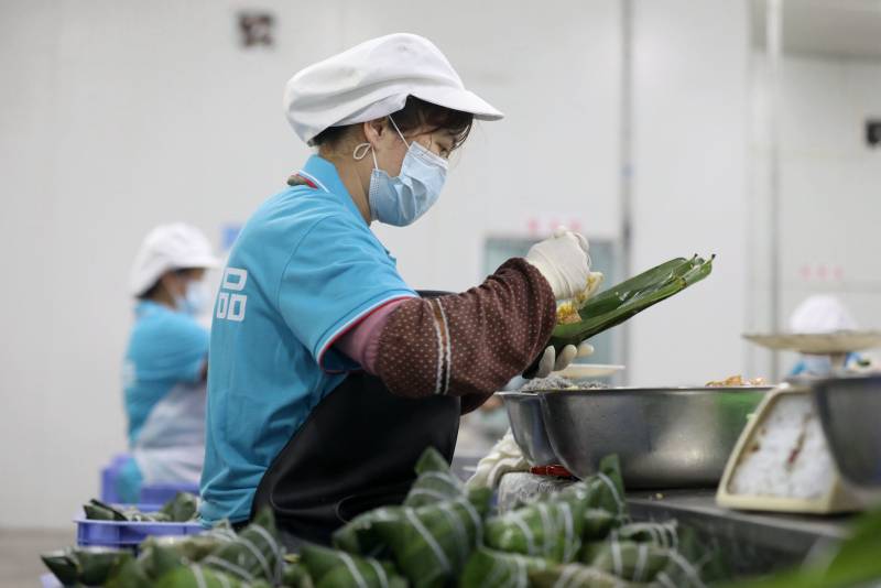 工人們?cè)谲囬g里包粽子。龔普康攝