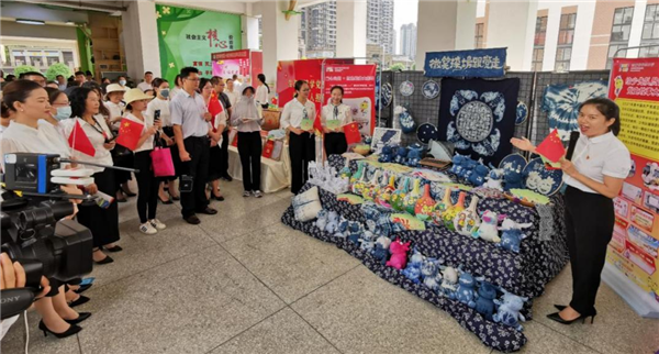 采訪團(tuán)在“微笑染坊跟黨走”主題展位前聽介紹 (央廣網(wǎng)發(fā) 唐澤龍攝)