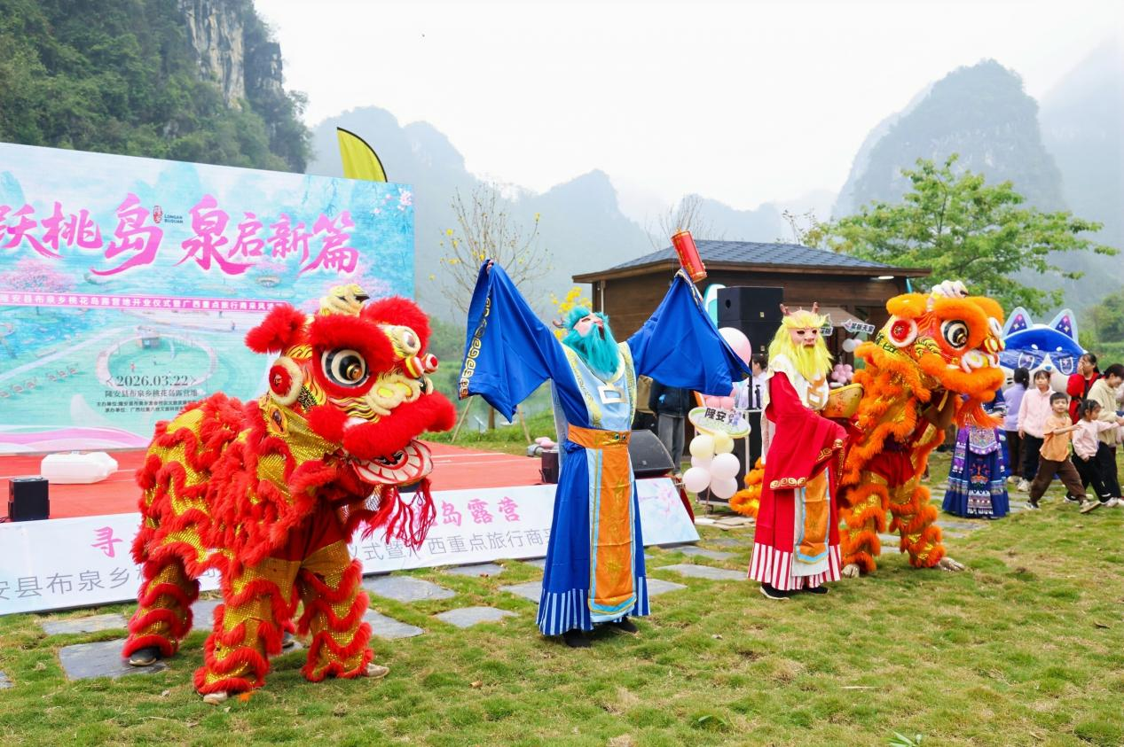 央廣網(wǎng)南寧3月24日消息(記者梁瑜琳)3月22日,布泉鄉(xiāng)桃花島露營地開業(yè)儀式以及廣西重點旅行商采風活動在南寧市隆安縣舉辦。啟動儀式上,隆安縣非遺醉獅與機器人、機器狗的精彩表演展現(xiàn)了傳統(tǒng)與科技的創(chuàng)新融合,將現(xiàn)場氛圍推向高潮。