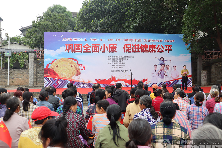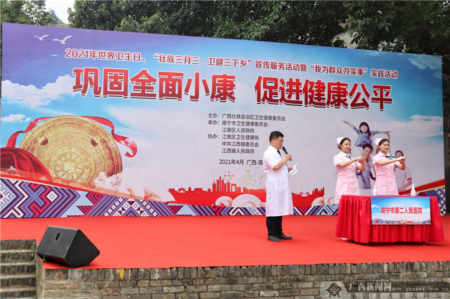 廣西新聞網(wǎng)南寧4月7日訊(記者 黎伊瑋)今年4月7日是第72個世界衛(wèi)生日,我國的宣傳主題為“鞏固全面小康,促進健康公平”。為了推動全區(qū)廣大人民群眾對衛(wèi)生健康的重視,不斷提高全區(qū)各族人民的健康水平,2021年世界衛(wèi)生日、“壯族三月三·衛(wèi)健三下鄉(xiāng)”宣傳服務活動暨“我為群眾辦實事”實踐活動在南寧市江西鎮(zhèn)揚美古鎮(zhèn)金馬街廣場舉行。此次活動由自治區(qū)衛(wèi)生健康委員會主辦,南寧市衛(wèi)生健康委員會、江南區(qū)人民政府承辦,江南區(qū)衛(wèi)生健康局、中共江西鎮(zhèn)委員會、江西鎮(zhèn)人民政府協(xié)辦。