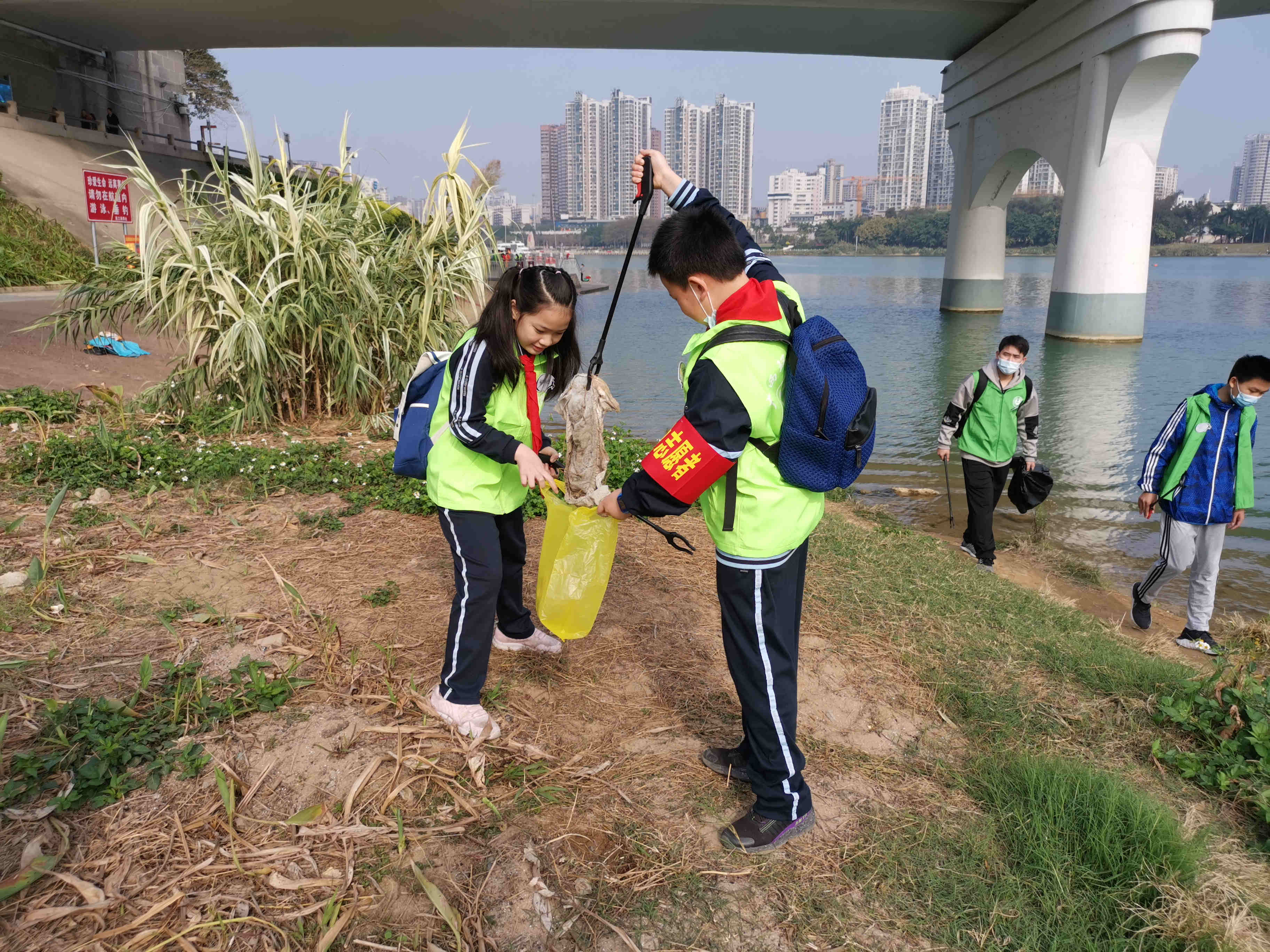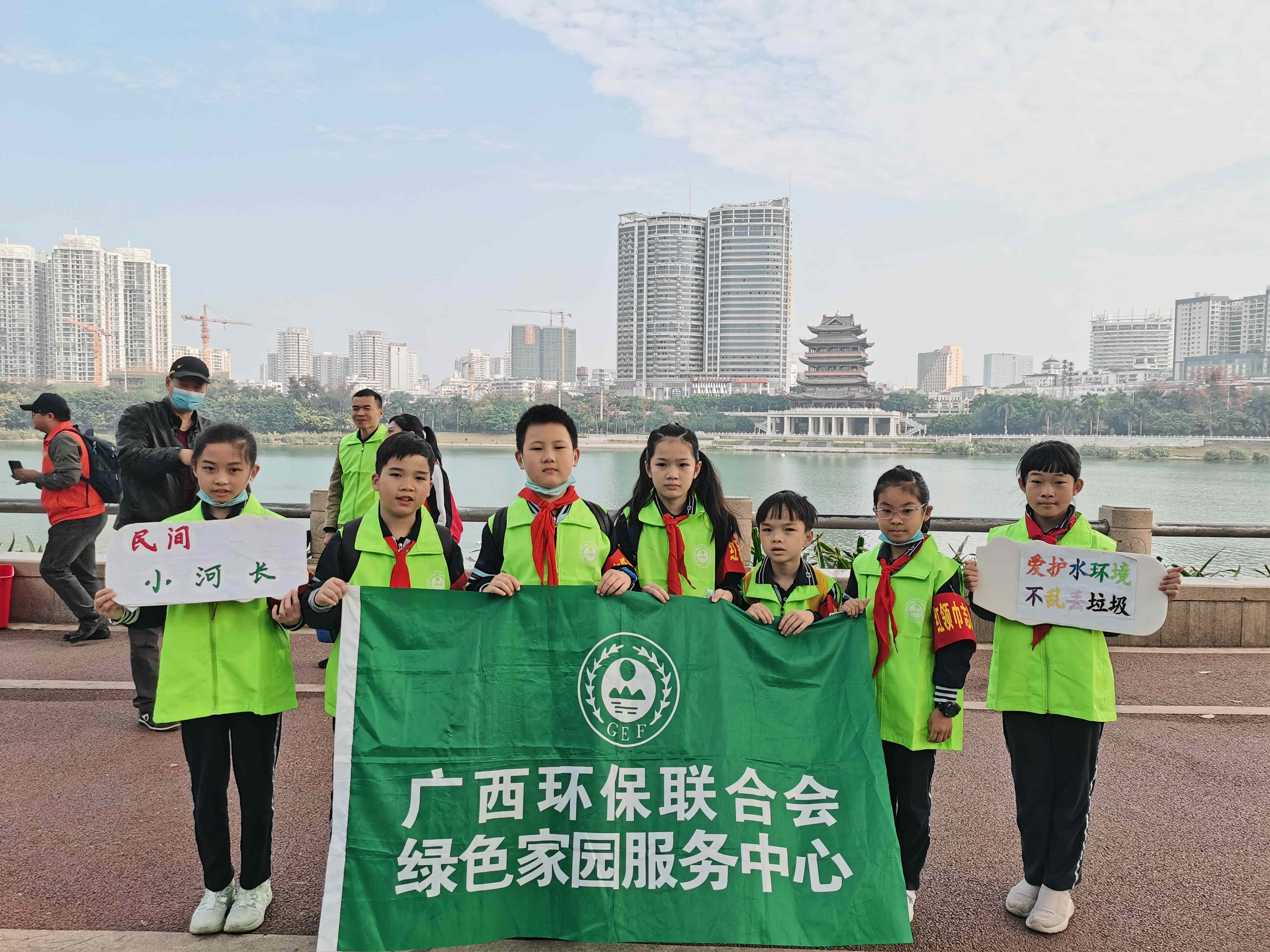 從邕江一橋到亭子碼頭,少先隊紅領(lǐng)巾志愿者和家長們觀察邕江環(huán)境,開展邕江清潔活動,并向江邊的人們宣傳“保護邕江環(huán)境,不隨意丟棄垃圾”的環(huán)保理念。