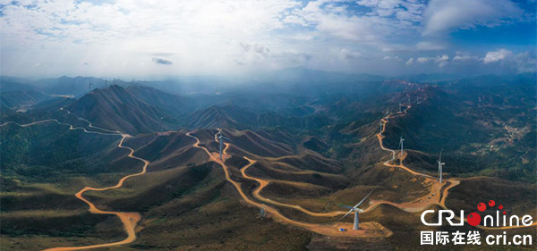 國際在線廣西頻道消息:在中國大唐馬王風力發(fā)電場,百米高的風電機佇立在馬王山的山頂,排列錯落有致。蜿蜒的山路把每個風電機連接起來,在航拍視角下,整個風電場宛如一條中國龍盤踞在馬王山,顯得雄偉壯觀。