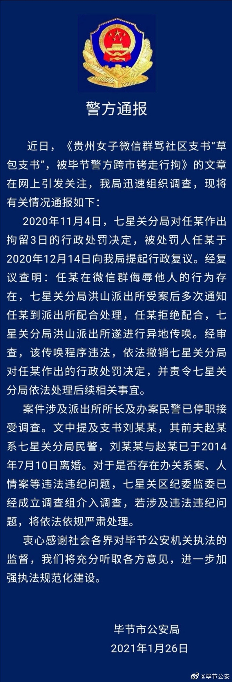 央廣網(wǎng)貴州1月27日消息(記者 李威)針對近日關(guān)于“貴州女子微信群辱罵社區(qū)書記,并被畢節(jié)警方跨市銬走行拘”一事,畢節(jié)市公安局發(fā)出通報:“任某在微信群侮辱他人的行為存在,七星關(guān)分局洪山派出所因任某拒絕配合進行異地傳喚。經(jīng)審查,該傳喚程序違法,依法撤銷七星關(guān)分局對任某作出的行政處罰決定,并責(zé)令七星關(guān)分局依法處理后續(xù)相關(guān)事宜。”