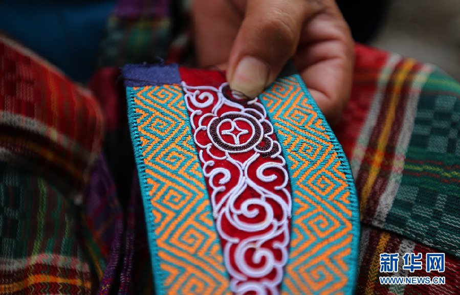 記者拍攝的水族背帶上的馬尾繡局部。新華網(wǎng) 盧志佳 攝 -
