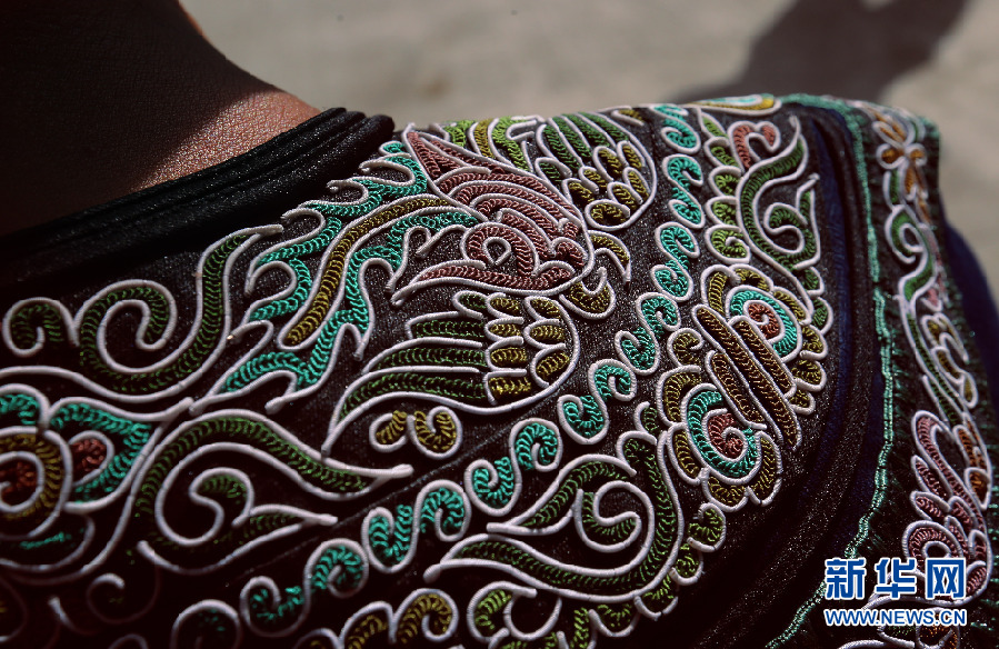 四川織繡和其他民族也有用馬尾為原材刺繡,但只有水族才如此集中地將之用于衣物和背帶等繡品。新華網(wǎng) 盧志佳 攝 -