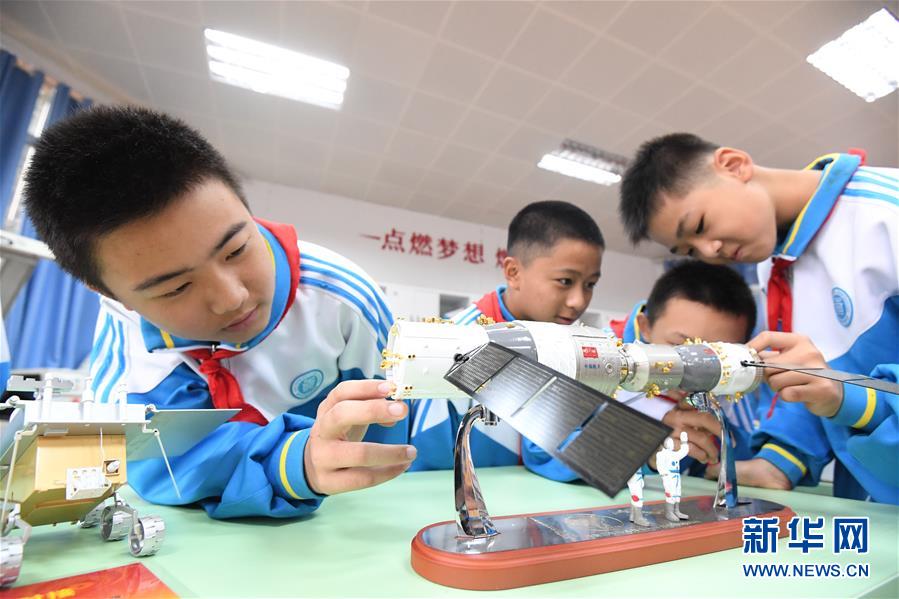 9月15日,貴州省貴陽市第十四中學的學生在校園創(chuàng)客基地參觀天宮二號與神舟十一號交會對接模型。