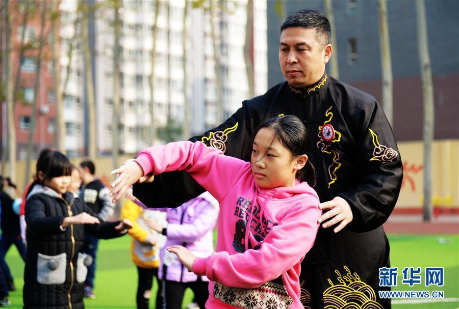11月16日,國家級非物質(zhì)文化遺產(chǎn)八卦掌傳承人郭浩在固安縣第四小學(xué)指導(dǎo)學(xué)生練習(xí)八卦掌。今年以來,河北省固安縣將郭氏八卦掌、高派面塑等縣內(nèi)十多個國家級、省級非遺項目引入校園,請非遺項目傳承人定期到學(xué)校給學(xué)生上課,豐富學(xué)生的知識面,促進(jìn)傳統(tǒng)文化的保護(hù)和傳承。新華社記者王曉攝 -