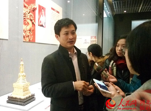 圖為在展覽現(xiàn)場(chǎng)的中華工藝美術(shù)大師袁長(zhǎng)君向媒體朋友和觀眾們介紹皇家金銀細(xì)工技藝。朱弘揚(yáng) 攝