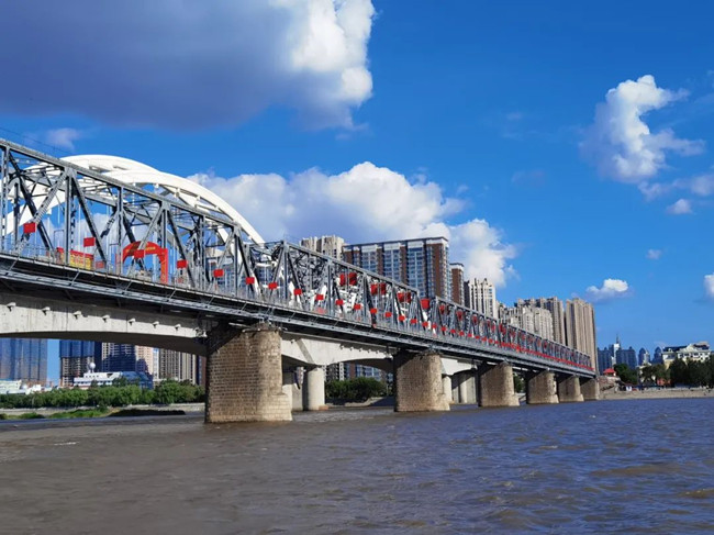 央廣網(wǎng)哈爾濱6月24日消息(記者馬俊瑋 實(shí)習(xí)生刁晨陽)近日,位于哈爾濱松花江畔的濱洲鐵路橋成為最紅“打卡地”,它是哈爾濱的第一座跨江橋梁,自1901年落成至今,已有120年的歷史,人們親切地稱它為“老江橋”。為迎接建黨百年,該橋裝飾有400余面紅旗和“100周年”的標(biāo)識,記錄了中東鐵路的通車和各個時期的重大事件,橋與天空、江水相銜接,成為一道亮麗的風(fēng)景線。