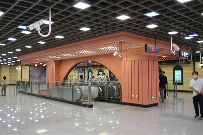 中央大街站內(nèi)采用歐式的裝修風(fēng)格,融合了中央大街地域建筑特色。站內(nèi)天花大面積采用灰色格柵,隨機(jī)排列燈具,將歐式建筑中室外雨棚、羅馬柱面進(jìn)行簡(jiǎn)化處理,加入到墻面的設(shè)計(jì)中,設(shè)置31塊藝術(shù)墻面,以屏幕為載體,播放百年老街的滄桑變化。