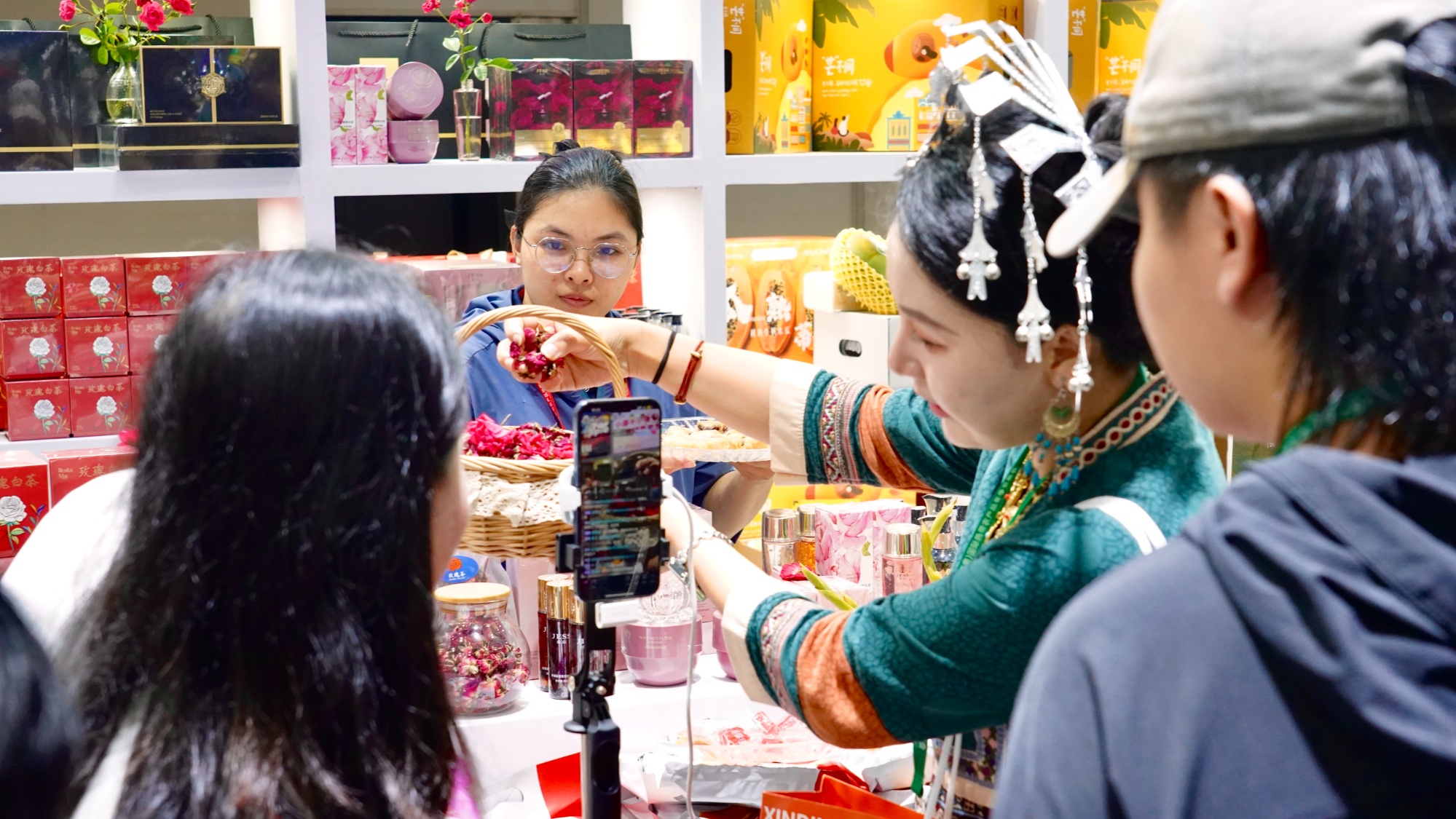 五指山展館憑借“年代記憶+民族文化+直播互動”的農(nóng)文旅融合創(chuàng)新模式,成為全場最具人氣的打卡地之一。