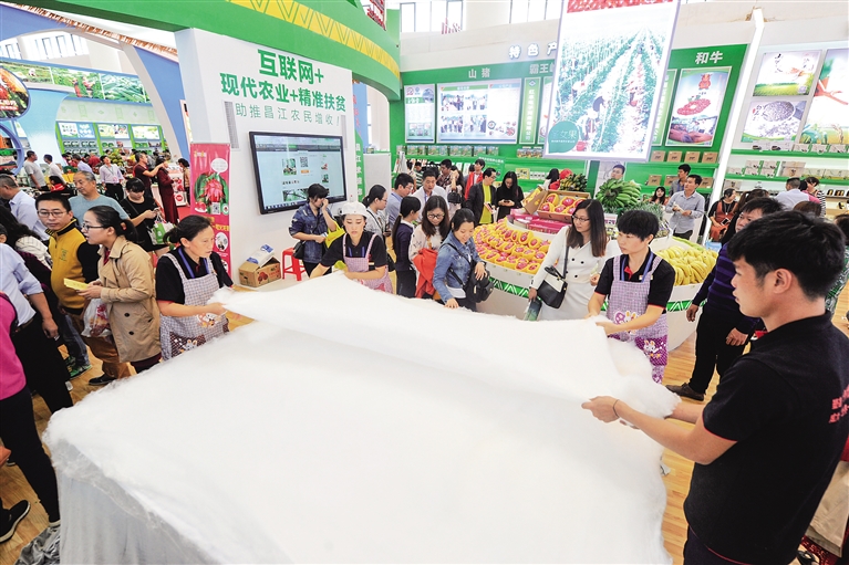 昌江展館的工作人員現(xiàn)場制作蠶絲被,引得人們駐足觀看。