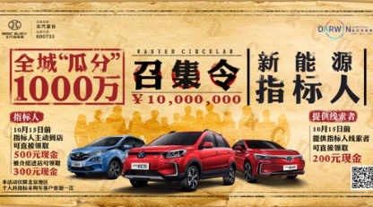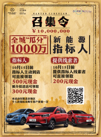 即日起到10月15日,北汽新能源在北京地區(qū),針對新能源車市準(zhǔn)車主們推出“全城瓜分1000萬!召集新能源指標(biāo)人”的主題福利活動。
