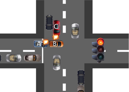 B車被A車以50km/h時速追尾后,又被時速50km/h的C車側(cè)面撞擊
