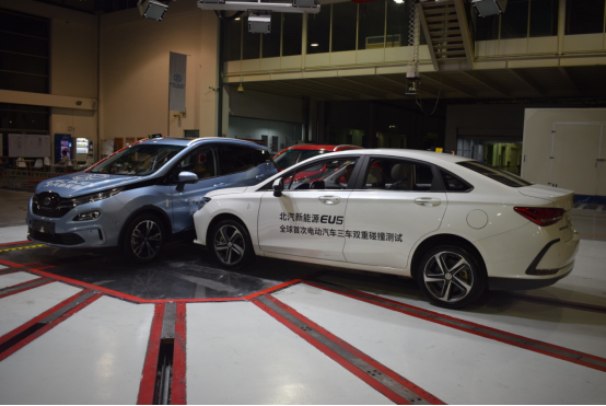 因此,中汽中心聯(lián)合北汽新能源開展了全球范圍內(nèi)首次公開電動汽車三車雙重碰撞測試,以極限條件驗證純電動汽車的被動安全和電氣安全,直擊消費者最關心的安全問題。