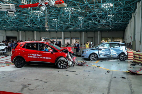 碰撞測試后,北汽新能源EX3沒有出現(xiàn)起火、冒煙、漏電等異常情況,參與碰撞的另外兩臺車也沒有出現(xiàn)類似的情況。
