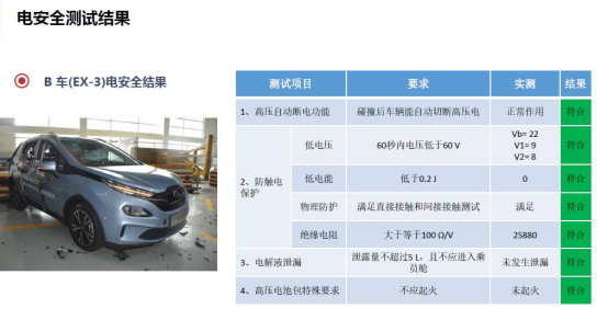 碰撞后測量,三臺車的高壓斷電裝置成功啟用,切斷了電池裝備與車身的連接,低電壓、低電能、物理防護等幾項參數(shù)均滿足要求,不會讓乘員有觸電的風險;另外,電池包也沒有起火風險,電解液也沒有泄露的情況。