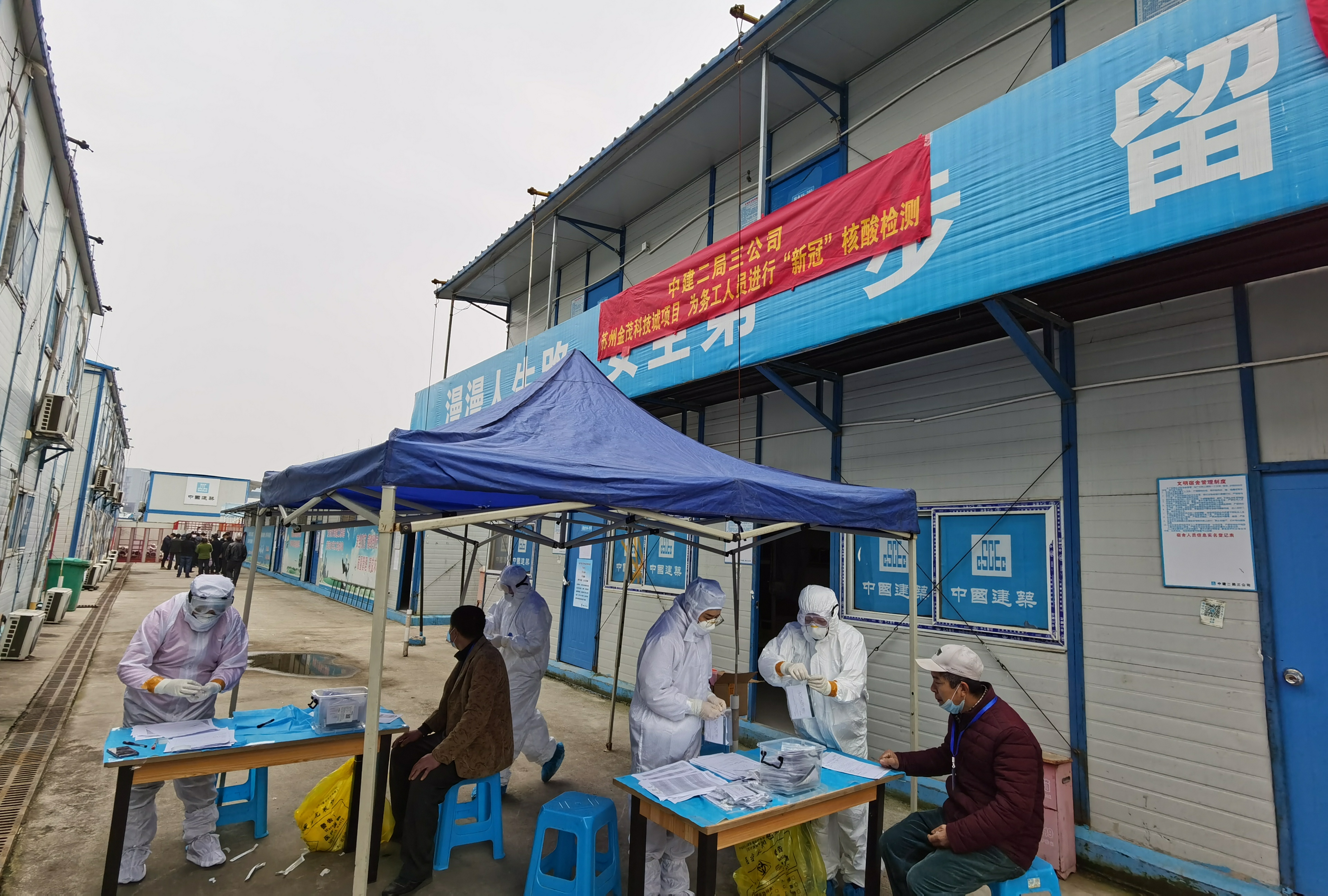 檢測(cè)過(guò)程實(shí)施中,為防止大規(guī)模人員聚集,蘇州科技城項(xiàng)目書(shū)記、紀(jì)檢小組組長(zhǎng)康思達(dá)對(duì)各部門(mén)通知要求,排隊(duì)等候檢測(cè)時(shí)人均間隔1.5米,檢測(cè)區(qū)域內(nèi)保證每次只進(jìn)一人,減少交叉感染風(fēng)險(xiǎn)。工人進(jìn)場(chǎng)后,先進(jìn)行消毒、測(cè)體溫、信息核實(shí),進(jìn)行每一間單間宿舍隔離,并立即做核酸檢測(cè),48小時(shí)出報(bào)告,合格后重新進(jìn)行人員宿舍調(diào)整,并可進(jìn)入施工現(xiàn)場(chǎng)開(kāi)展施工內(nèi)容。