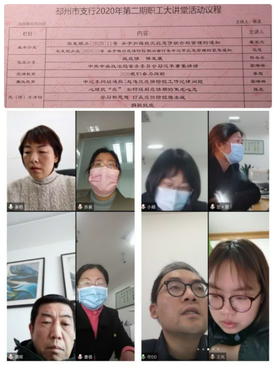 為貫徹落實上級行關(guān)于加強新型冠狀病毒感染的肺炎疫情防控工作系列要求,充分發(fā)揮黨支部在疫情防控中的基礎(chǔ)保障作用,調(diào)適疫情下返崗復(fù)工員工心理,2月28日,農(nóng)發(fā)行邳州支行利用云視頻會議系統(tǒng)開展“心理防疫”黨日活動,進一步扎緊員工心理防疫“口罩。