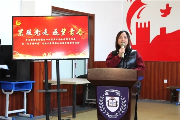 本次活動由郭玲老師主持,太原市彩虹雙語學校黨支部書記侯武、初中部主任張志華、政教主任賈曉露及初中部全體師生一起聆聽了青年講師的深情講述。