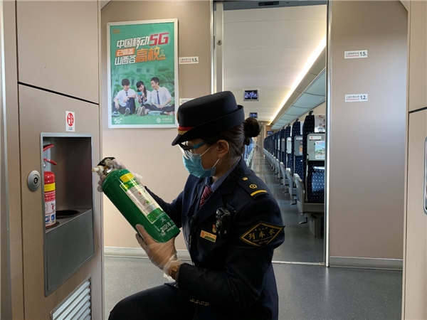 雖然高鐵上不允許抽煙,但并不代表無消防安全隱患,在出乘前牛蕊再次檢查消防設施,對全車滅火器逐一排查,確保消防設施到位。