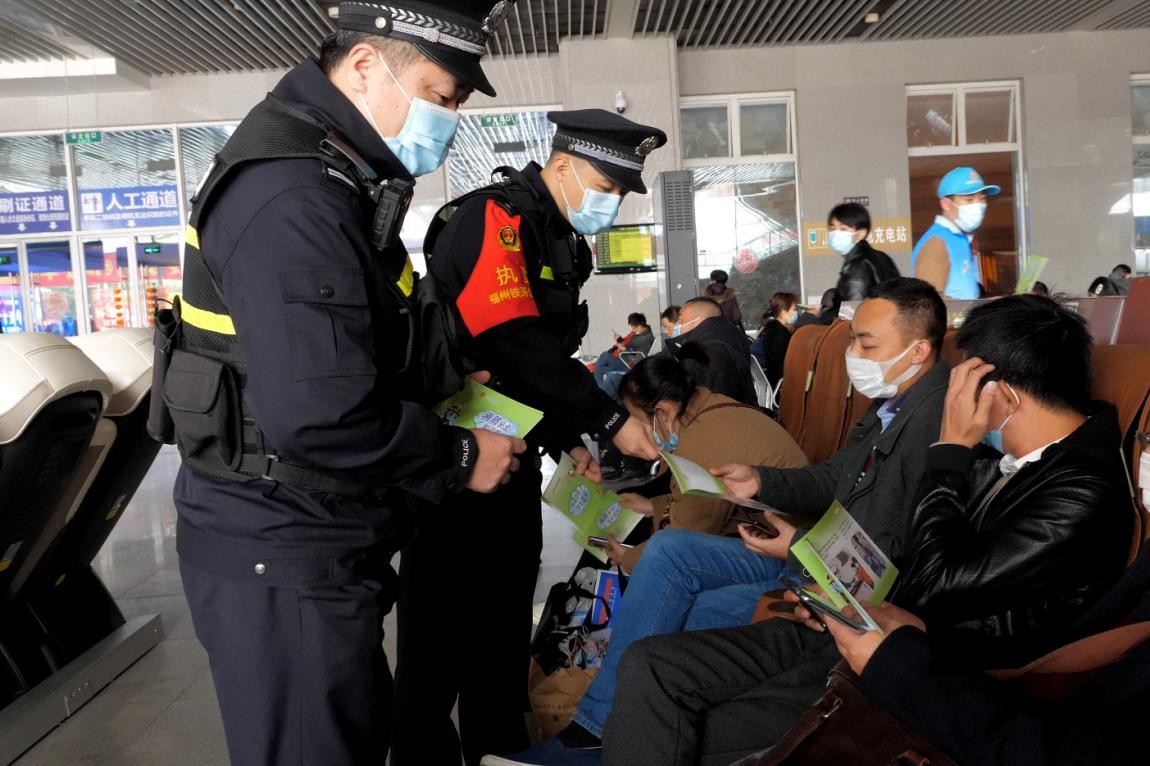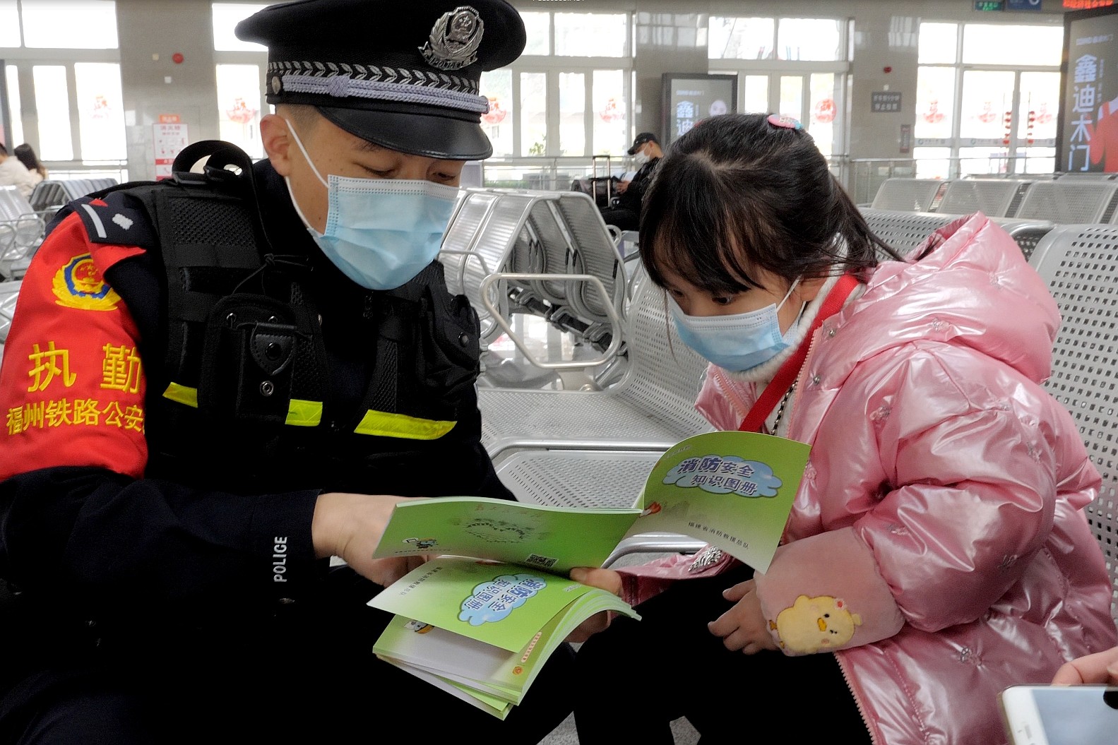 在動(dòng)車站候車大廳,鐵路民警與消防志愿者為等候上車的旅客分發(fā)消防安全手冊,為他們講解消防器材的用途等消防常識(shí),并通過消防控制室廣播臺(tái)向旅客播放消防安全常識(shí)。