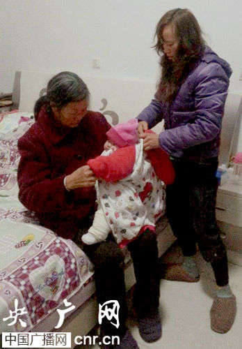 2月19號(hào)夜,在四川樂山的一個(gè)農(nóng)家,大娘給不到半歲的女嬰小臭(音)裹上冬衣,準(zhǔn)備由民警送到福利院去。娃娃剛到這個(gè)家里一個(gè)月,是鞠某通過網(wǎng)上買來的。