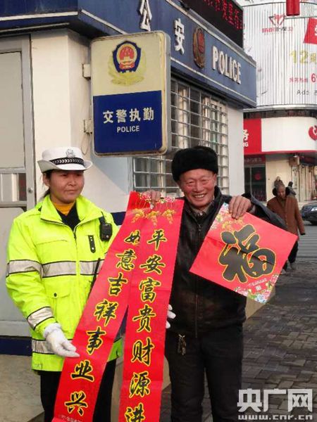 1月18日,西峽交警大隊(duì)紫金崗?fù)っ窬瘞е喾鶎β?lián)以及交通安全宣傳彩頁在白羽路附近展開了送春聯(lián)活動。