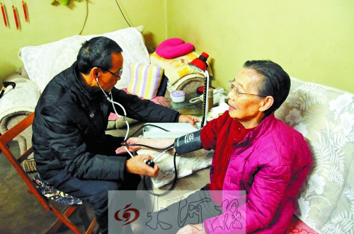 70歲的志愿者何師義每周都要為90歲的郭瑞浦老人量血壓 杜小偉 攝