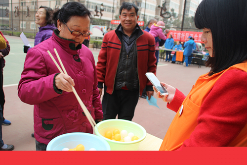 項目組結(jié)合前期入戶調(diào)研結(jié)果,以及軍工群體本身的特點,設(shè)置本次運動會的主題項目,共九項:項目宣傳-有獎競猜區(qū)、“趣味大挪移”、“跳跳球”、“同色魔方”、“盲人擊鼓”、“托球奔跑”、“趕豬進欄”、手工展示區(qū)-“幸福墻”、以及醫(yī)務(wù)區(qū)。參與者首先領(lǐng)取參加本次活動的“參與券”,然后進入項目宣傳-有獎競猜區(qū),了解本次活動的主辦方及其他相關(guān)信息,接著就可以自愿參與到每項游戲中,每通過一關(guān)就可以獲得2枚印花,最終獲得印花數(shù)多者即可獲得獎品一份。網(wǎng)球場上不時傳來陣陣笑聲,有的在蒙眼擊鼓,有的在認真的擲球,有的則在快速奔跑……正如軍工們留在“幸福墻”上面的一句句話:“祝愿祖國早日實現(xiàn)中國夢”、“祝愿社工活動越辦越好”、“全民動員,鍛煉身體”等,無不彰顯著來自軍工群體的別樣風(fēng)采。