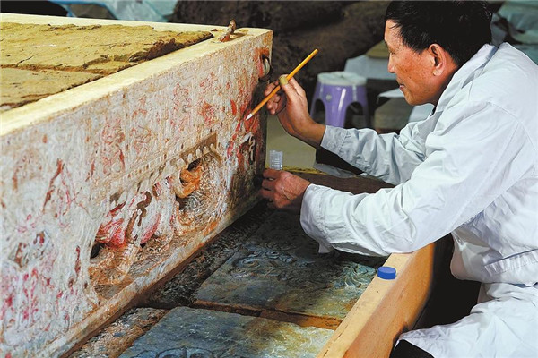 工作人員在對石棺床的彩繪進(jìn)行加固。