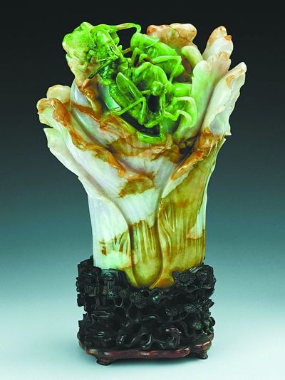 在中國(guó)的玉雕技法中,還有一項(xiàng)獨(dú)具特色,即為“俏色”。有些玉料中經(jīng)常帶有一些雜色,棄之可惜,匠人們便以雜色部分的形與色為基礎(chǔ)進(jìn)行設(shè)計(jì)。清代玉雕《翡翠蟈蟈白菜》即采用了此類技法進(jìn)行雕琢。白菜根部基本呈白色,而白菜的頂部及蟈蟈的形態(tài)運(yùn)用玉的黃、綠之色進(jìn)行表現(xiàn),塑造出了白菜被霜凍之后的質(zhì)感以及綠蟈蟈在食用白菜時(shí)的場(chǎng)面,極富自然妙趣。中國(guó)古人歷經(jīng)數(shù)千年不斷鉆研、創(chuàng)新玉石雕刻技藝,時(shí)至今日,這些技法的綜合運(yùn)用,更能烘托出玉石之美。