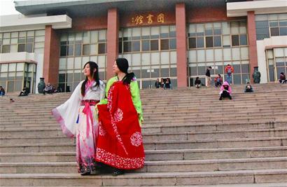 昨天下午,農(nóng)大圖書(shū)館前,大學(xué)生們?nèi)宄扇鹤谂_(tái)階上看書(shū),中間兩個(gè)穿著漢服的女孩特別引人注目!敖(jīng)?吹剿齻冞@樣穿!薄白餍惆!”“在排練情景劇?”學(xué)生們對(duì)此似乎見(jiàn)怪不怪,但都說(shuō)不出她們到底在干什么。說(shuō)話(huà)間,兩名“漢服女孩”起身,一路聊一路走著,校園林蔭道、教室里、小河邊,兩人的出現(xiàn)成了一道獨(dú)特的風(fēng)景,每到一處立馬引來(lái)同學(xué)們的目光。
