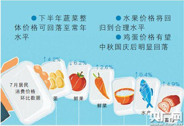 與上月相比,7月CPI由下降0.1%轉(zhuǎn)為上漲0.4%。其中,食品價(jià)格環(huán)比由上月下降0.3%轉(zhuǎn)為上漲0.9%,影響CPI環(huán)比漲幅擴(kuò)大約0.19個(gè)百分點(diǎn)。促使食品價(jià)格由降轉(zhuǎn)升的具體因素有哪些?