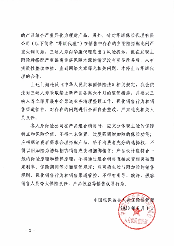 此外,監(jiān)管指出,針對華康保險代理有限公司在銷售中存在的主附險搭配比例嚴重失調(diào)問題,三峽人壽向華康代理發(fā)出了風險提示,但在發(fā)現(xiàn)主附險搭配嚴重偏離重疾保障本源的情況沒有明顯改善后,未有實質(zhì)性整改舉措,直到網(wǎng)絡(luò)文章曝光相關(guān)問題,才停止與華康代理的合作。