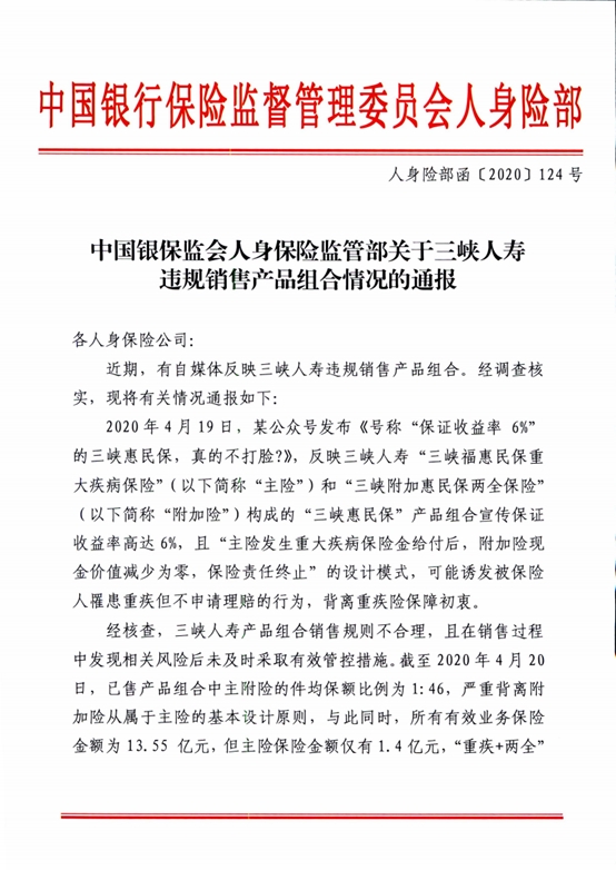 公眾號文章引發(fā)監(jiān)管關(guān)注,銀保監(jiān)會核查后定性三峽人壽的產(chǎn)品組合銷售規(guī)則不合理,且在銷售過程中發(fā)現(xiàn)相關(guān)風險后未及時采取有效管控措施。