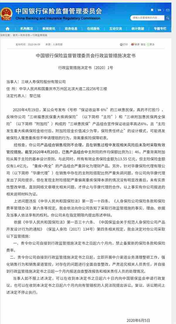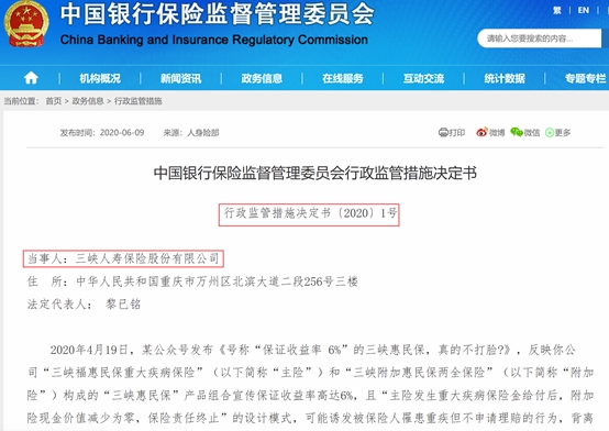 曾經(jīng)頻頻有“爆款”保險產(chǎn)品刷屏的三峽人壽領(lǐng)取銀保監(jiān)會2020年1號罰單。近日,銀保監(jiān)會披露三峽人壽保險產(chǎn)品組合銷售規(guī)則不合理被自媒體曝光,且在銷售過程中發(fā)現(xiàn)相關(guān)風險后,未及時采取實質(zhì)性整改舉措,因而被叫停新產(chǎn)品備案6個月。