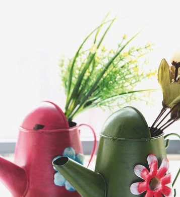 澆花用的水壺總是給人感覺冷冰冰的,為它也穿上花衣吧!在水壺上畫花感覺太平淡,那么用薄的鐵片制作好鐵片花粘上去一定很有立體感吧?